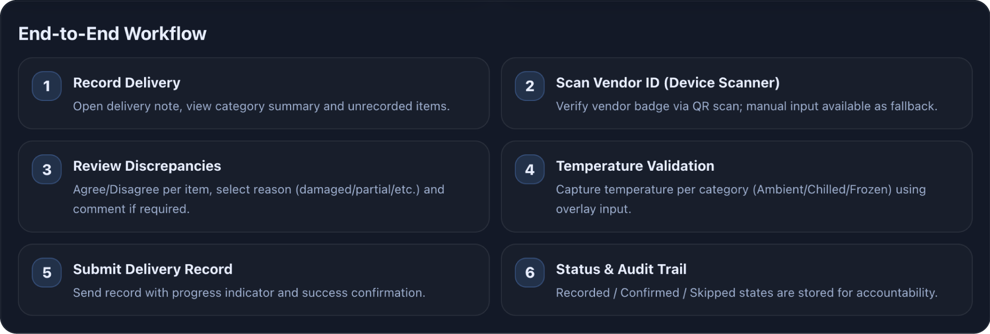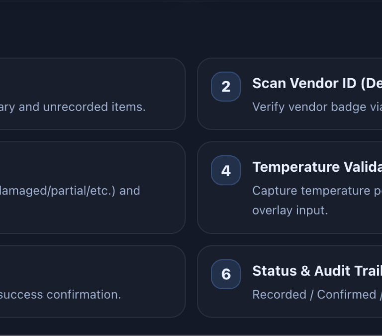 This solution is built for controlled logistics environments where a dedicated handheld scanner device is used during receiving. The UI is optimized for quick scanning, minimal taps, and reliable confirmation—so teams can record deliveries accurately and create an audit-ready trail.